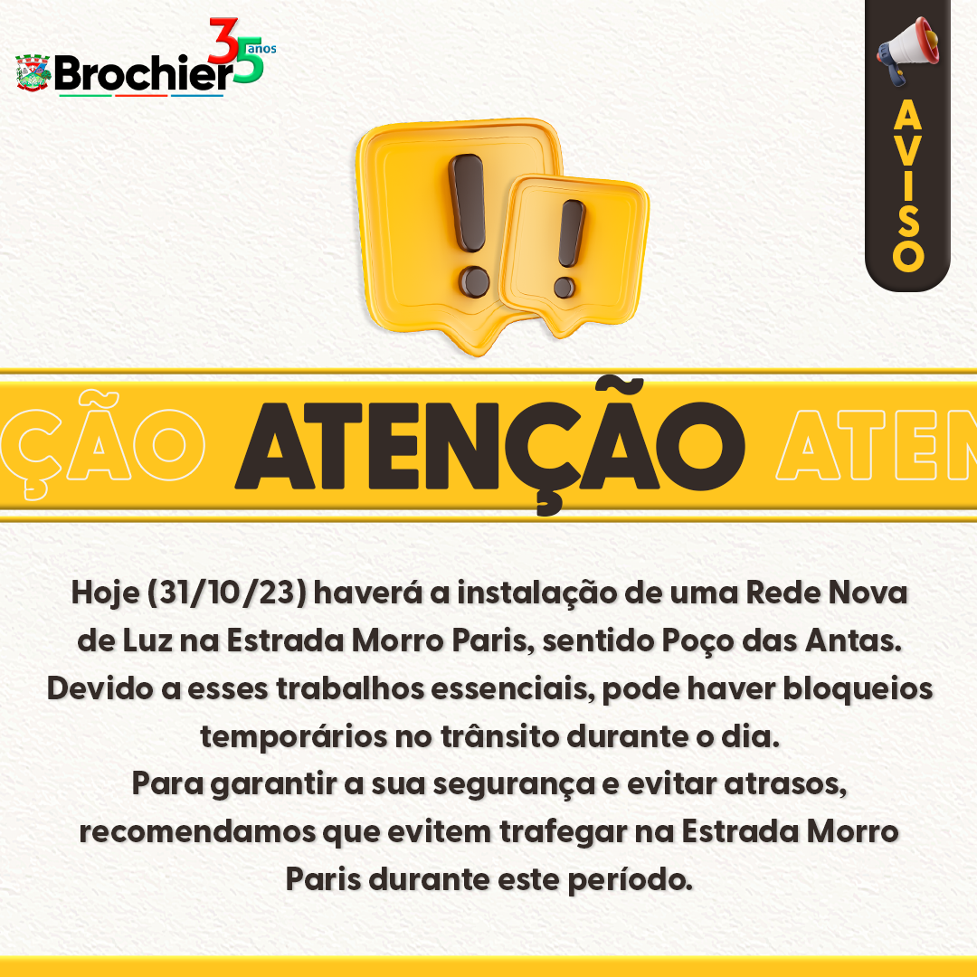 No dia 31/10, está prevista a substituição de postes na localidade de Paris em direção ao Paris Baixo (Poço das Antas) com previsão de que o serviço se estenda ao longo de todo o dia.