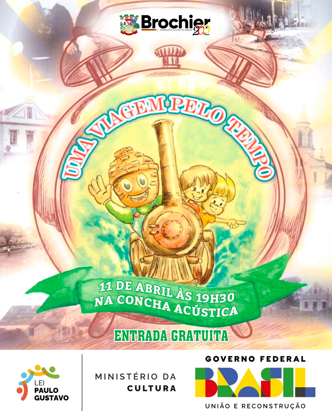 O Espetáculo Teatral “Uma Viagem pelo Tempo” vai contar a história de Brochier na noite do dia 11 de abril de 2024 na Concha Acústica, dentro da programação do 36º Aniversário de Brochier e XIII Rodeio Crioulo de Brochier. 22 grupos culturais e sociais do município farão parte da encenação, além de atores, figurantes e convidados, com Tuti Kerber no comando da produção. O espetáculo também vai virar filme, eternizando a história e a cultura local, integrando as comemorações alusivas aos 200 anos da imigração alemã no Brasil no município de Brochier.