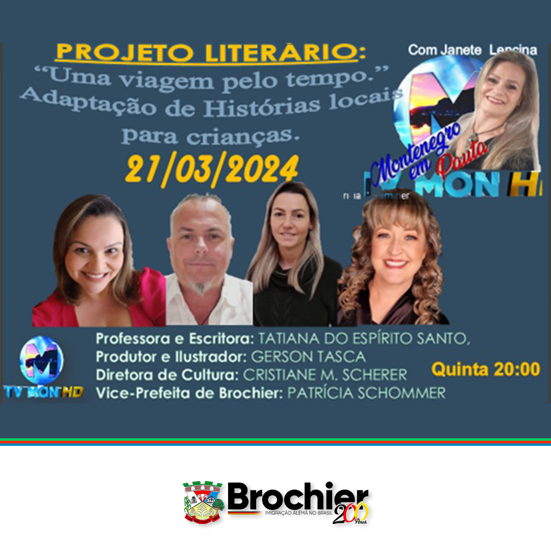 Hoje, dia 21, às 21h, na TV MON HD Canal 06, não perca o programa "Montenegro em Pauta" com Janete Lencina. Serão entrevistados a Vice-Prefeita e Secretária de Educação, Patricia Schommer, a Diretora de Cultura, Cristiane Scherer, e as escritoras Tatiana do Espírito Santo e Leani Veiga Koppe, em uma conversa ilustrada por GERSON TASCA.