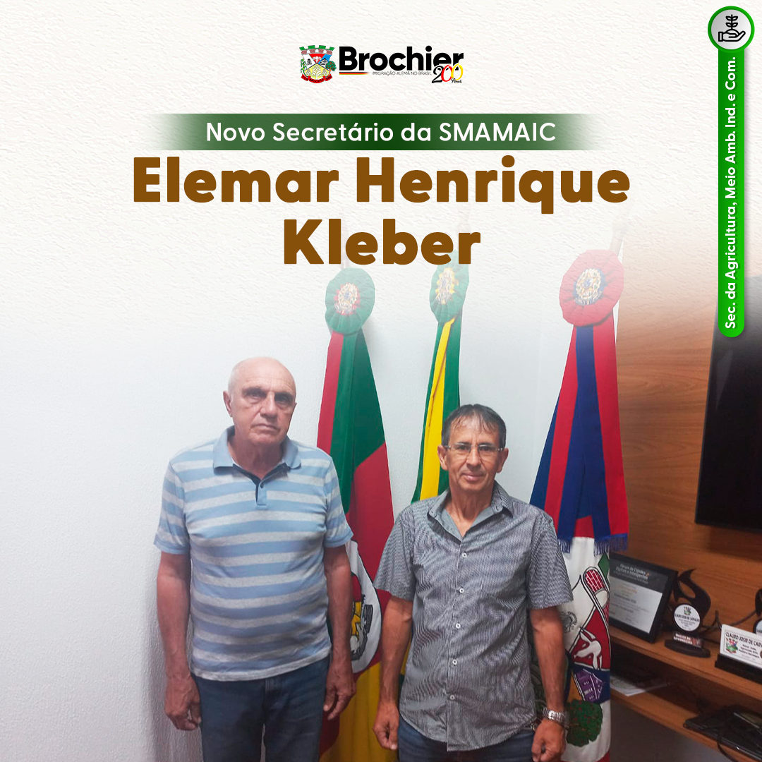 A Administração Municipal tem a satisfação de dar as boas-vindas ao senhor Elemar Henrique Kleber, que assume a importante função de secretário do Meio Ambiente, Agricultura, Indústria e Comércio de Brochier. Estamos confiantes em sua capacidade de contribuir significativamente para o progresso e desenvolvimento de nossa cidade. Agradecemos ao aceite do convite e desejamos sucesso!