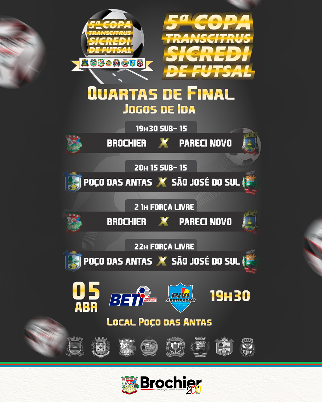 Hoje é dia de jogo em busca de mais 3 pontos nesta competição muito importante. Convidamos a todos para irem apoiar os times de Brochier em Poço das Antas.