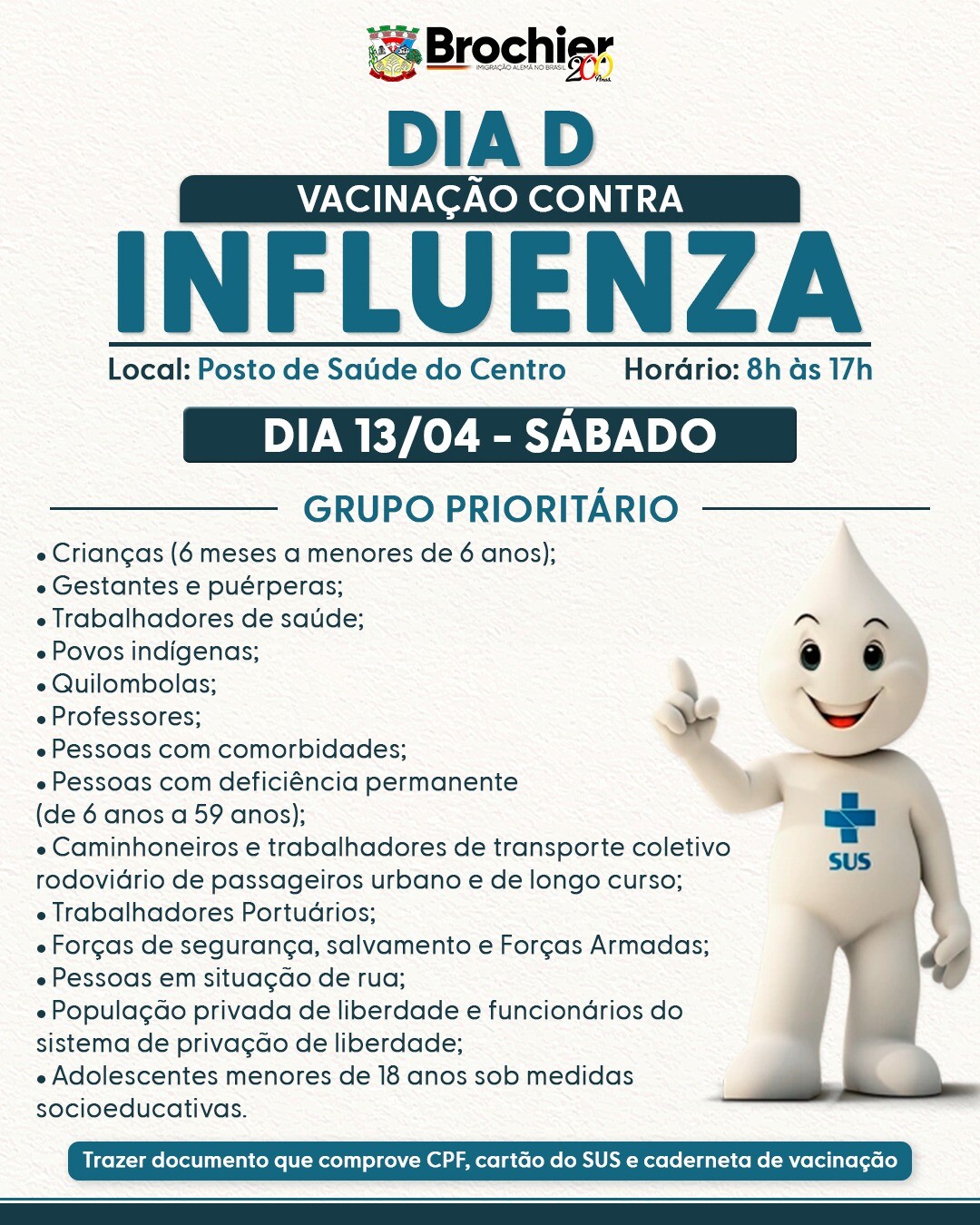 Marque na sua agenda: 13/04, sábado, das 08h às 17h, no posto de saúde mais próximo.