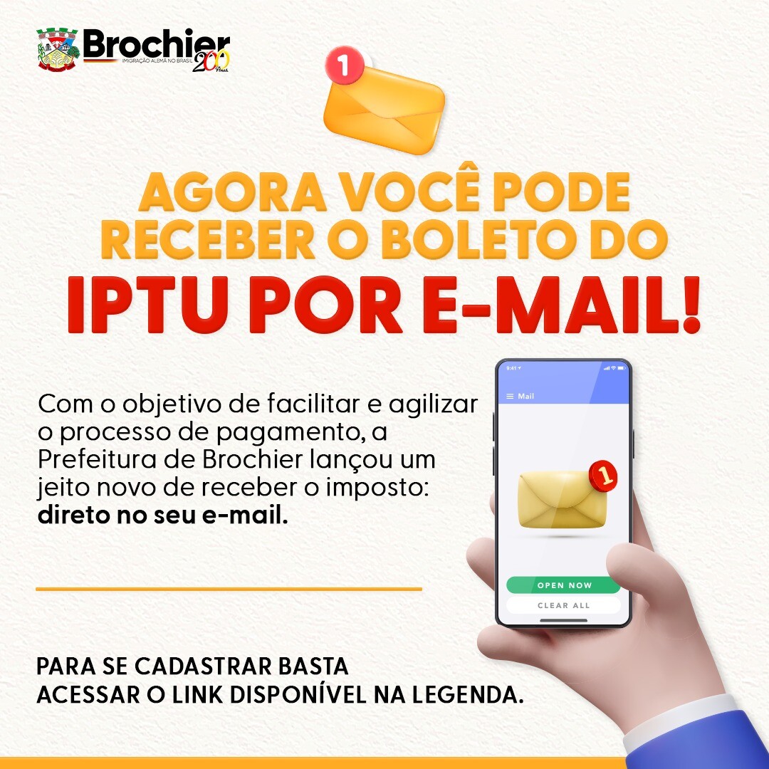 Agora ficou mais fácil e rápido receber o boleto do IPTU! A Prefeitura de Brochier lançou um jeito novo de receber o imposto: direto no seu e-mail. Basta se cadastrar no link abaixo. Assim, você evita papelada e recebe tudo na sua caixa de entrada.
