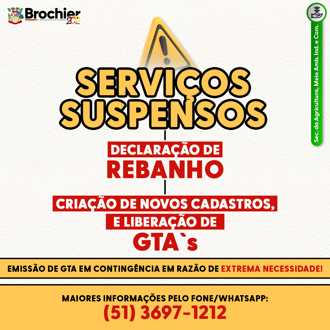 Devido as fortes chuvas e alagamentos os computadores da PROCERGS, que abrigam os sistemas do Governo do Estado, tiveram de ser desligados para evitar um colapso da rede. Por isso a Secretaria da Agricultura de Brochier COMUNICA, que assim como em todo o restante do Estado, está impossibilitada de proceder com a Declaração do rebanho, bem como criar novos cadastros e liberar GTA’s (Guias de Trânsito Animal).