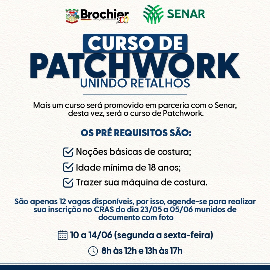 ➡️ São apenas 12 vagas disponíveis, por isso, agende-se para realizar sua inscrição no CRAS a partir do dia 23/05 a 05/06 munidos de documento com foto