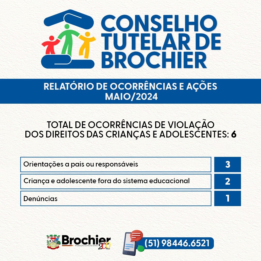 Relatório de ocorrências e ações do Conselho Tutelar de Brochier nos meses de maio de 2024.