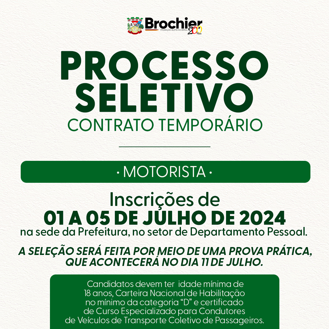 A Prefeitura Municipal de Brochier abriu hoje (01/07) as inscrições para contrato temporário de Motorista. Os interessados podem se inscrever junto a sede da Prefeitura, no setor de Departamento Pessoal do dia 01 a 05 de julho, no horário das 8:30h às 11:30h e das 13:30h às 17:00h. Para participar, os candidatos devem ter idade mínima de 18 anos, Carteira Nacional de Habilitação no mínimo da categoria “D” e certificado de Curso Especializado para Condutores de Veículos de Transporte Coletivo de Passageiros. A seleção será feita por meio de uma prova prática, que acontecerá no dia 11 de julho. Acesse a integra do edital: https://www.brochier.rs.gov.br/contratacao/view/196/processo-seletivo-simplificado-0072024-motorista