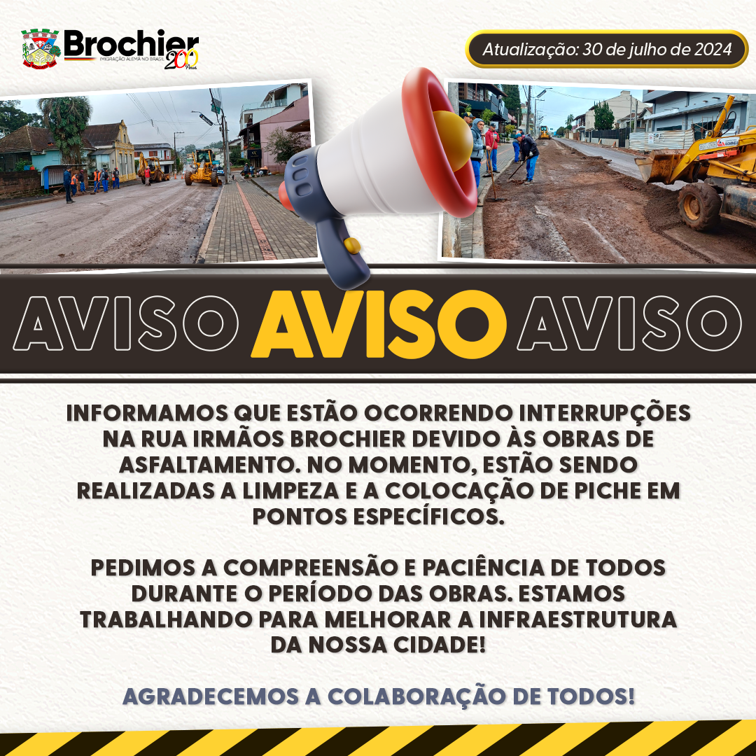 INFORMAMOS QUE ESTÃO OCORRENDO INTERRUPÇÕES NA RUA IRMÃOS BROCHIER DEVIDO ÀS OBRAS DE ASFALTAMENTO. NO MOMENTO, ESTÃO SENDO REALIZADAS A LIMPEZA E A COLOCAÇÃO DE PICHE EM PONTOS ESPECÍFICOS.