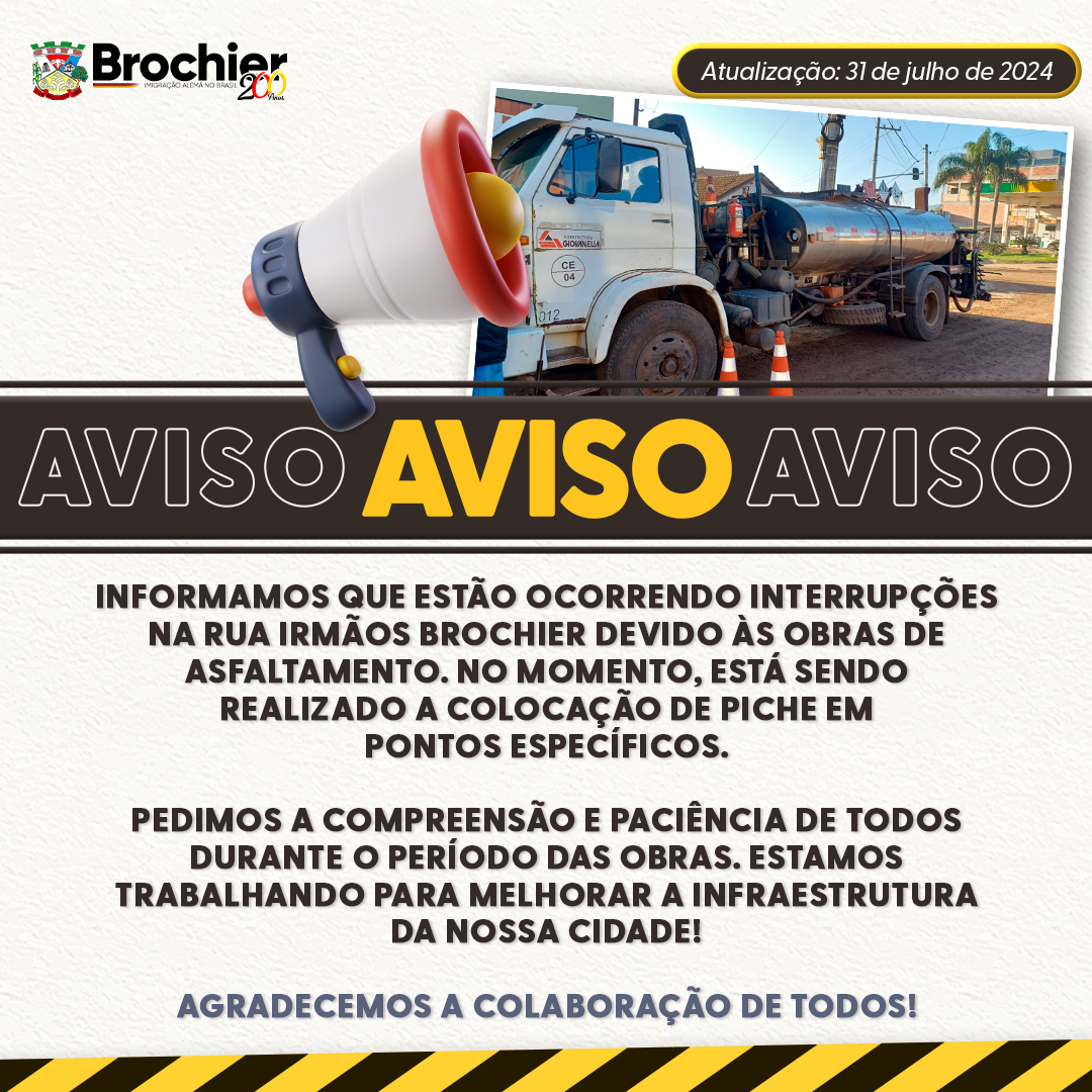 INFORMAMOS QUE ESTÃO OCORRENDO INTERRUPÇÕES NA RUA IRMÃOS BROCHIER DEVIDO ÀS OBRAS DE ASFALTAMENTO. NO MOMENTO, ESTÁ SENDO REALIZADO A COLOCAÇÃO DE PICHE EM PONTOS ESPECÍFICOS.
