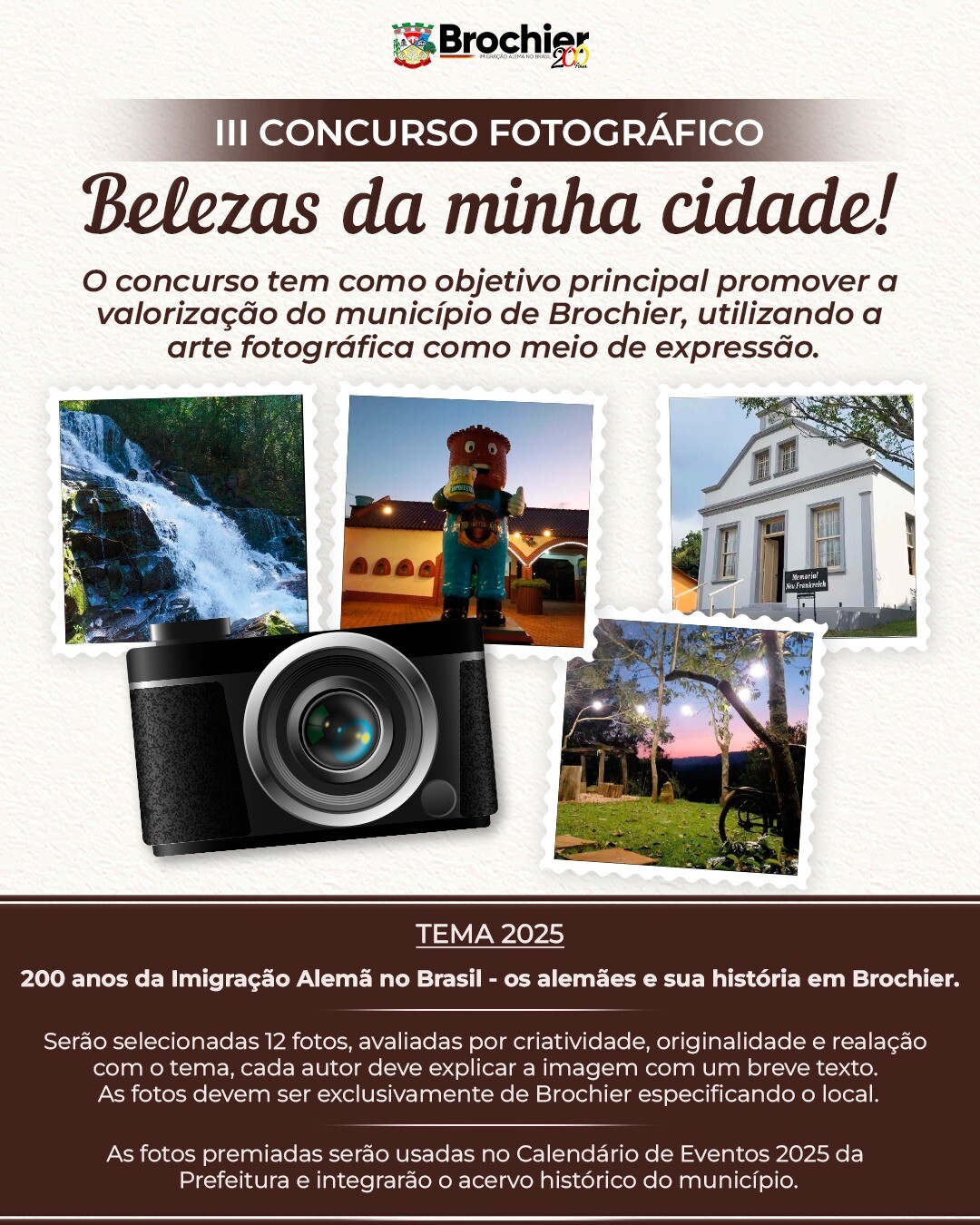 Participe do III Concurso Fotográfico Belezas da Minha Cidade e mostre seu talento! O tema deste ano celebra os “200 anos da Imigração Alemã no Brasil – os alemães e sua história em Brochier”. Capte imagens que retratem a influência alemã em nossa cultura, arquitetura, gastronomia e muito mais. As 12 melhores fotos serão selecionadas para o Calendário de Eventos de 2025 e farão parte do acervo histórico da cidade. Mostre sua criatividade e contribua para valorizar as belezas de Brochier!