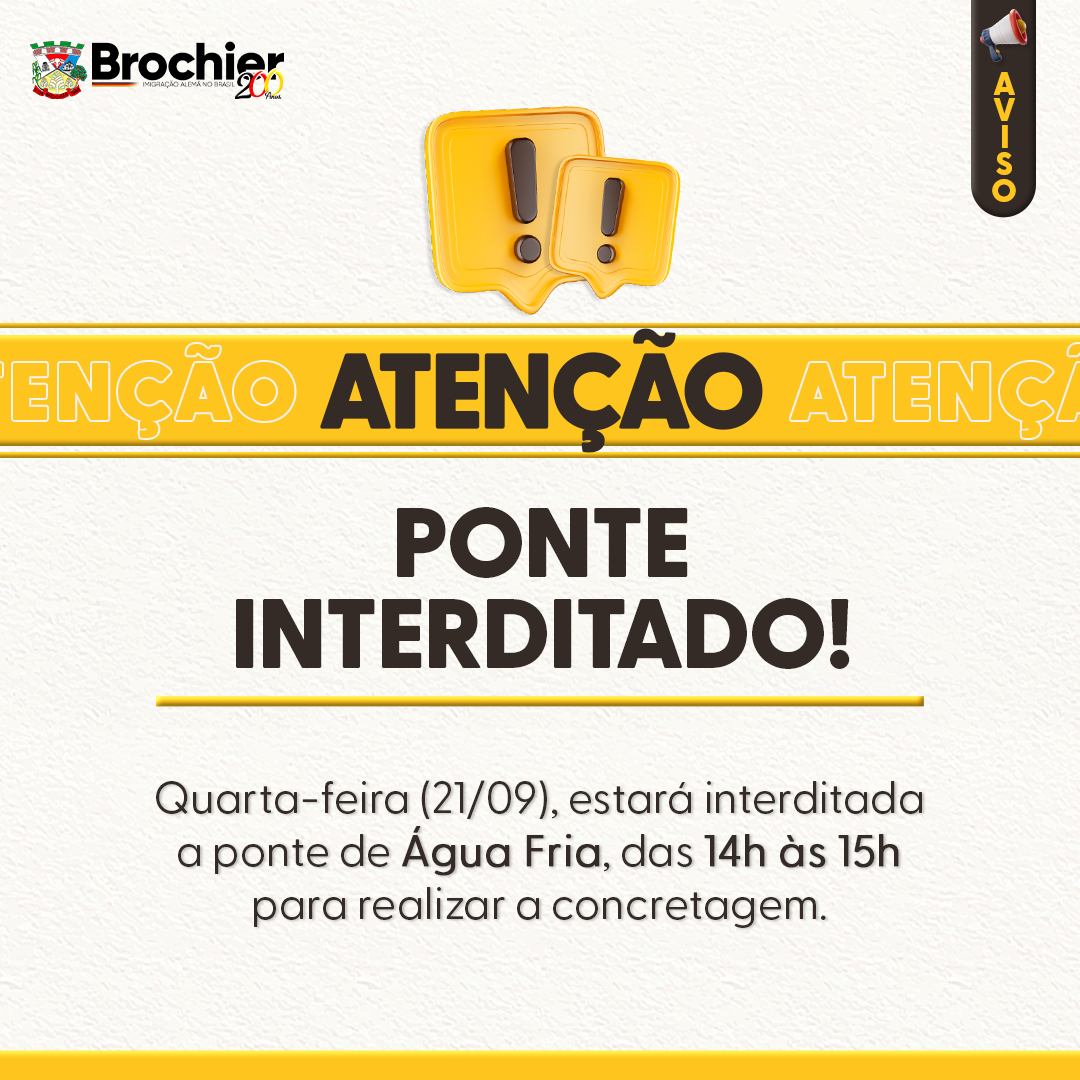 Quarta-feira (21/09), estará interditada a ponte de Água Fria, das 14h às 15h para realizar a concretagem.