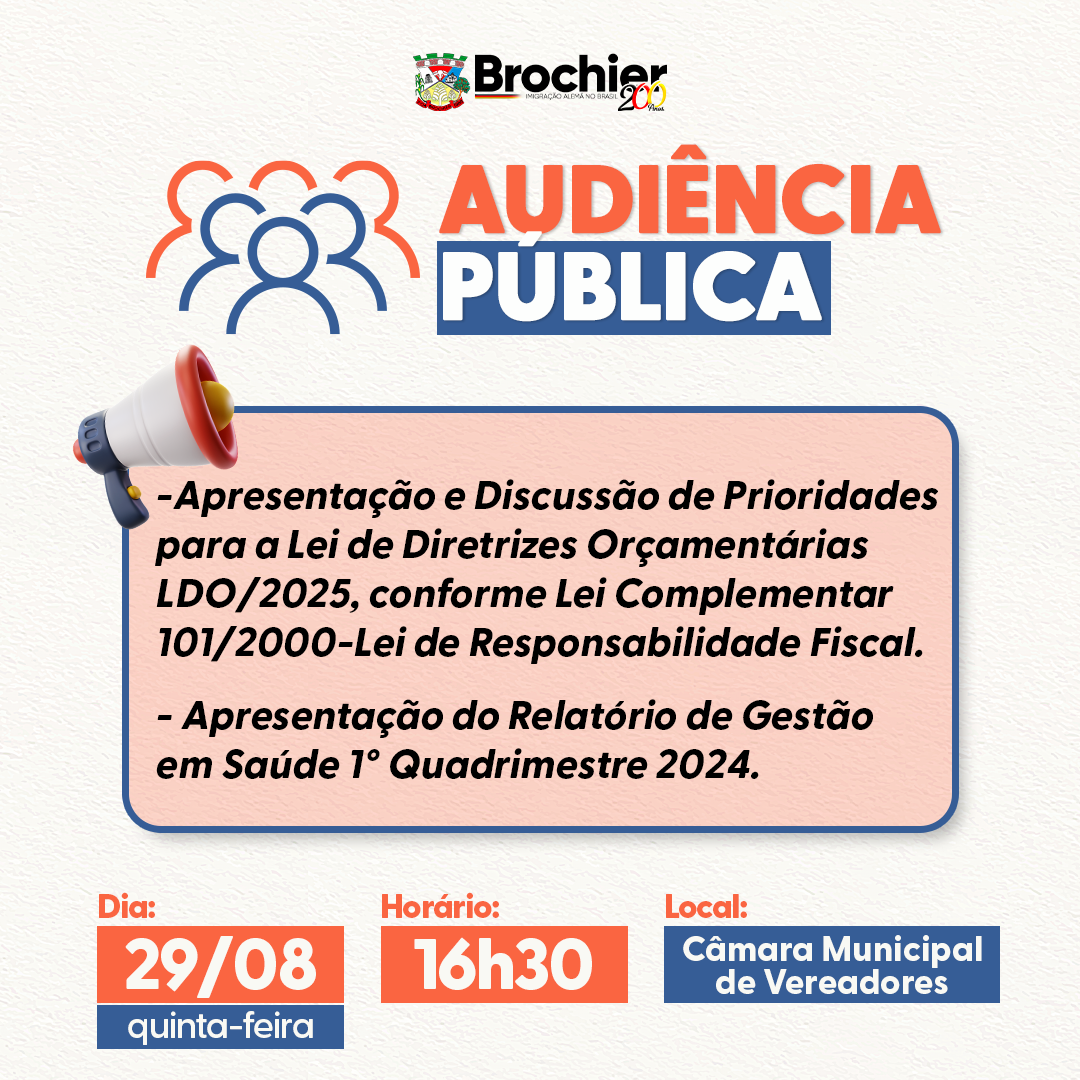 Participe da Audiência Pública para discutirmos e avaliarmos juntos a LDO/2025. Além disso, haverá a apresentação do Relatório de Gestão em Saúde referente ao 1º Quadrimestre de 2024. Sua presença é essencial!