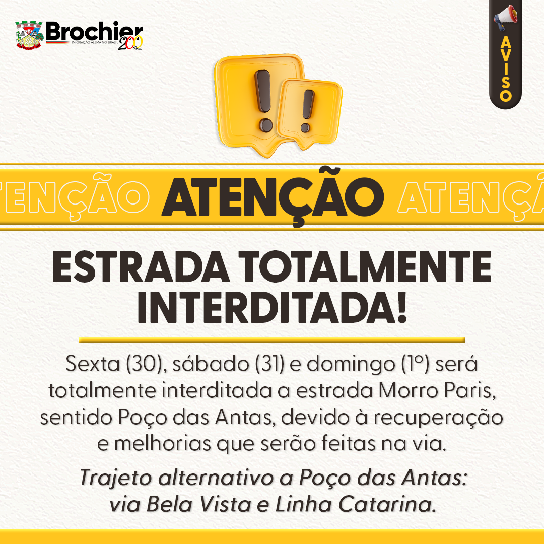 Sexta (30), sábado (31) e domingo (1°) será totalmente interditada a estrada Morro Paris, sentido Poço das Antas, devido à recuperação e melhorias que serão feitas na via.