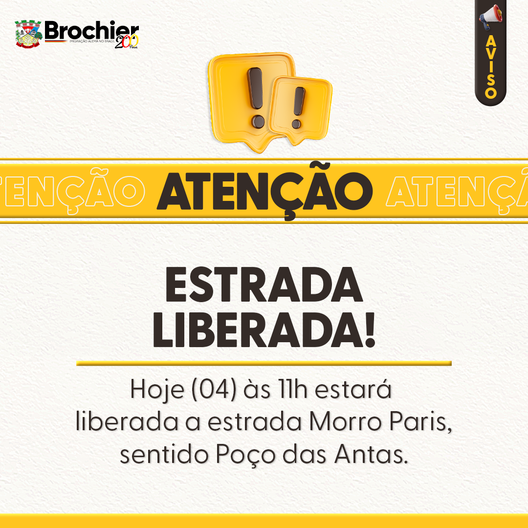 Hoje (04) às 1lh estará liberada a estrada Morro Paris, sentido Poço das Antas.
