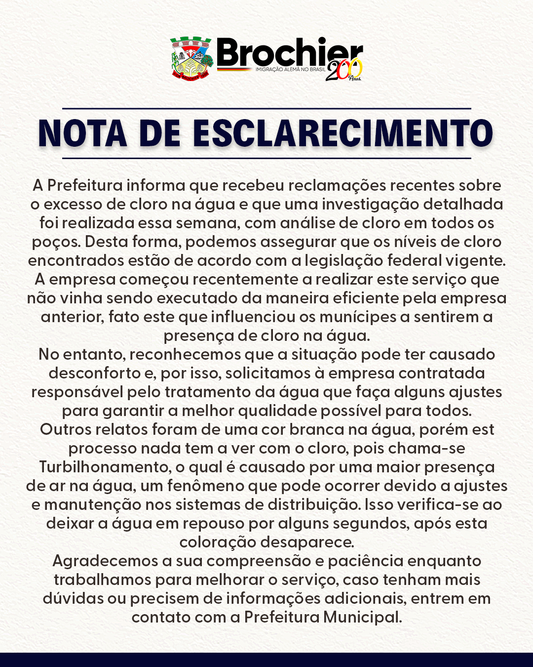 A Prefeitura informa que recebeu reclamações recentes sobre o excesso de cloro na água e que uma investigação detalhada foi realizada essa semana, com análise de cloro em todos os poços. Desta forma, podemos assegurar que os níveis de cloro encontrados estão de acordo com a legislação federal vigente.