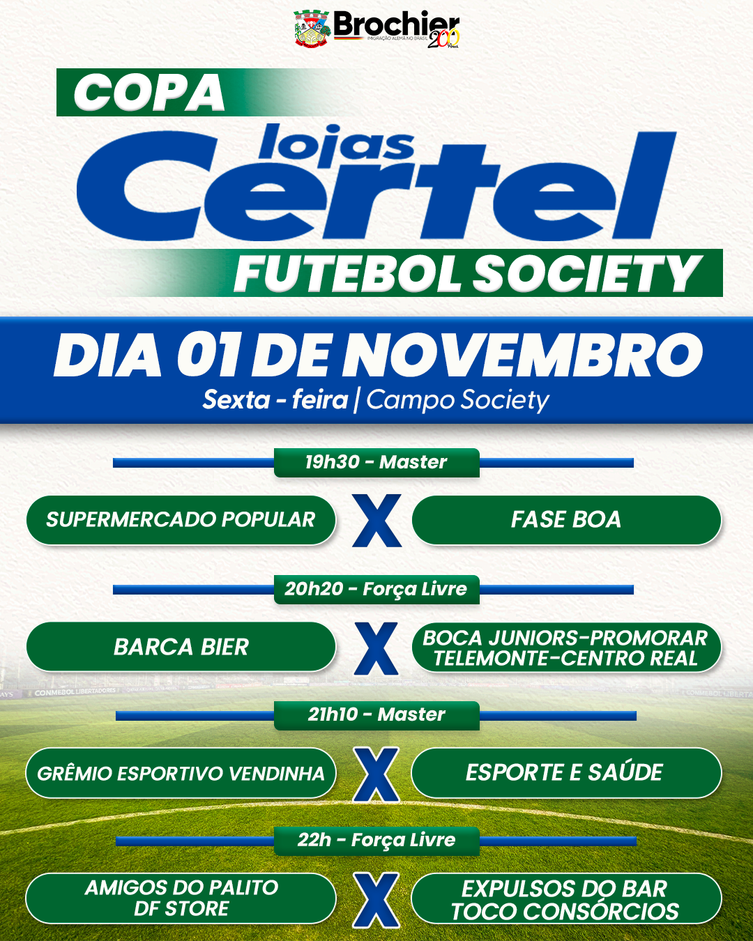 Você é nosso convidado especial para acompanhar os jogos a partir das 19h30, no Campo Society em Brochier ⚽️