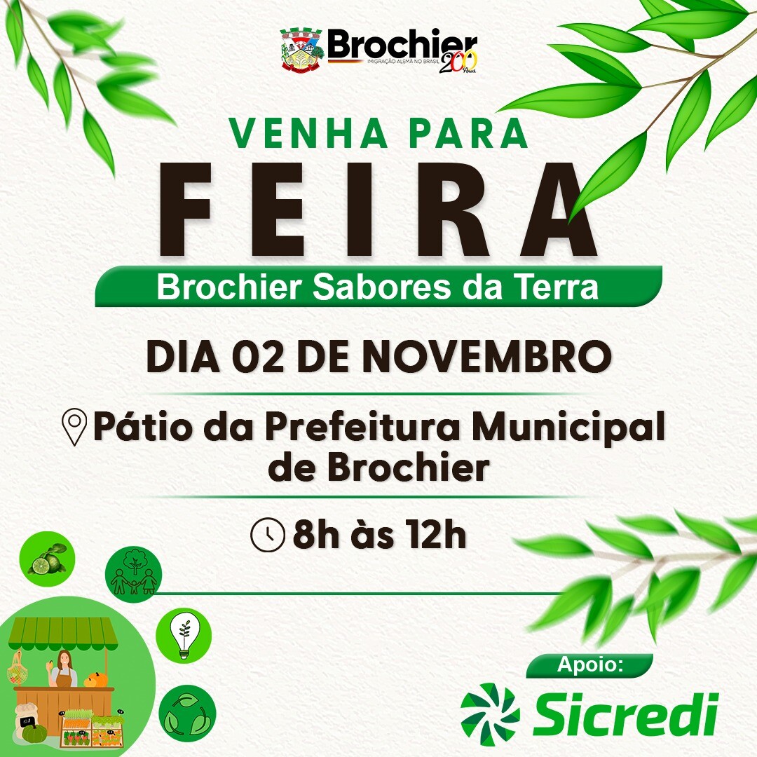 Participe de mais uma edição da Feira Brochier Sabores da Terra! Será neste sábado, das 8h às 12h, no pátio da Prefeitura Municipal. Venha aproveitar as delícias dos produtos coloniais e encantar-se com artesanatos únicos. Esperamos você!