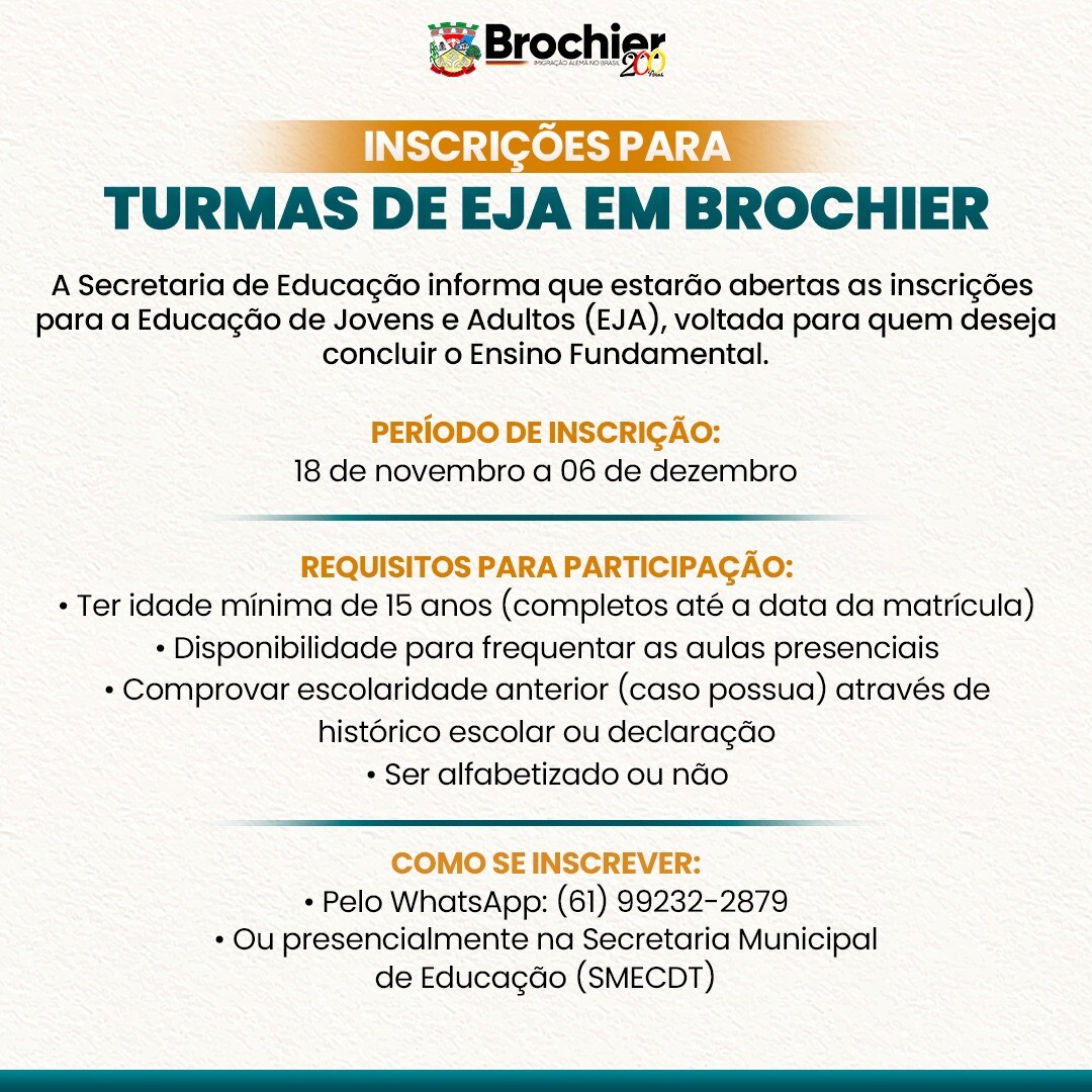 Inscrições Abertas para EJA em Brochier!