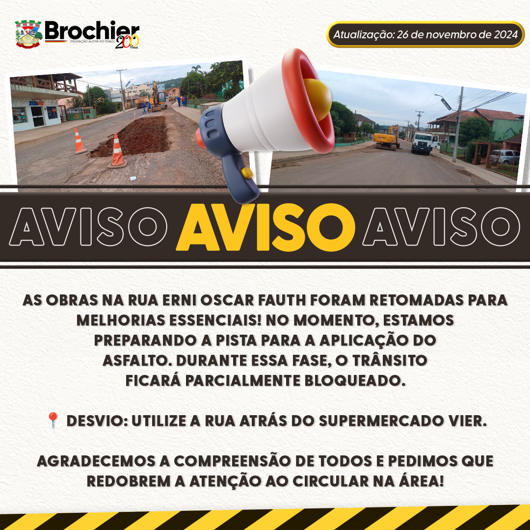 As obras na Rua Erni Oscar Fauth foram retomadas para melhorias essenciais! Atualmente, estamos preparando a pista para a aplicação do asfalto. Durante esta fase, o trânsito ficará parcialmente bloqueado.