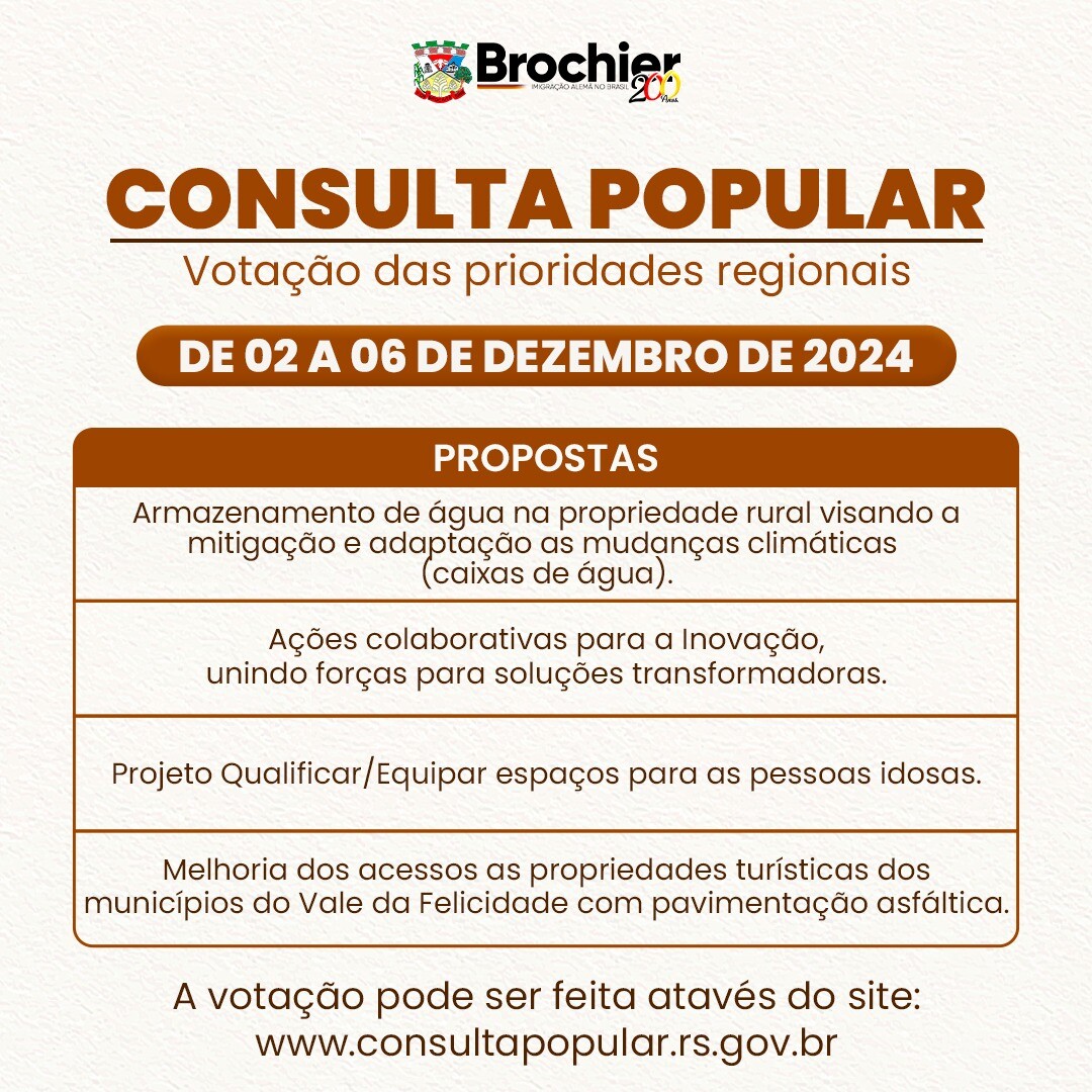 Inicia hoje a etapa final da Consulta Popular 2024, onde os cidadãos podem escolher as prioridades regionais que integrarão o Orçamento do Estado. A votação vai até sexta-feira, 6 de dezembro, às 23h59, e pode ser feita pelo portal on-line (www.consultapopular.rs.gov.br) ou pelo WhatsApp, no número (51) 3210-3260.