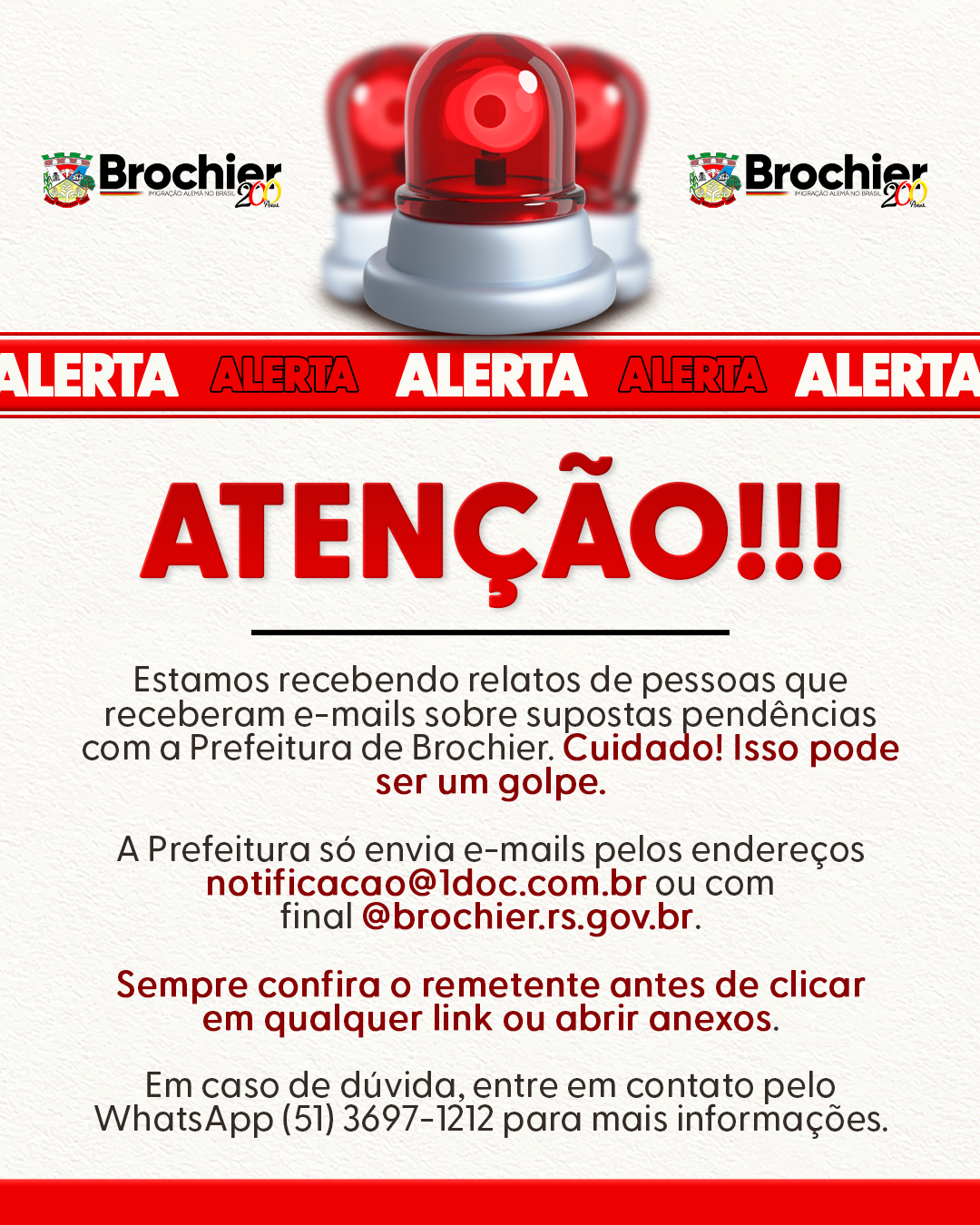 Estamos recebendo relatos de pessoas que receberam e-mails sobre supostas pendências com a Prefeitura de Brochier. Cuidado! Isso pode ser um golpe.