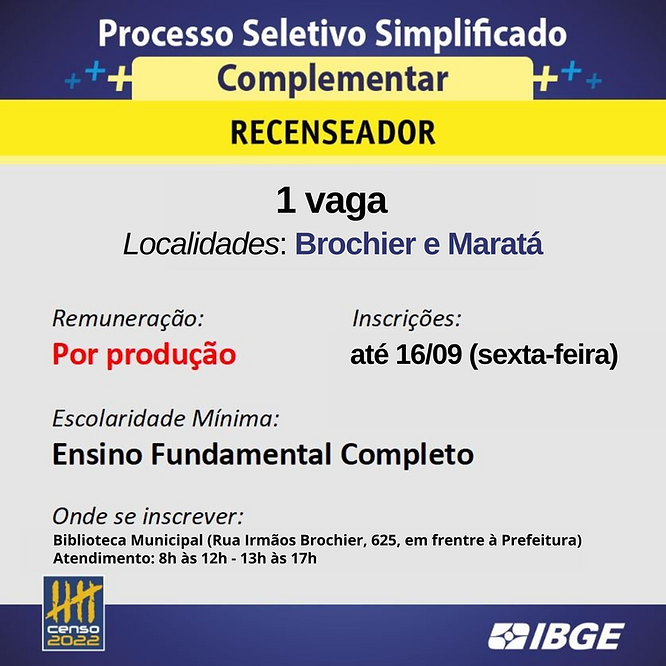 Atenção munícipes: o Instituto Brasileiro de Geografia e Estatística (IBGE) está oferecendo uma (01) vaga para o cargo de Recenseador no Censo 2022 em Brochier e Maratá, através de processo seletivo simplificado. A vaga exige Ensino Fundamental completo e remunera o funcionário contratado de acordo com sua produtividade, com horário de trabalho flexível.