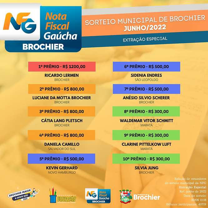 Nesta edição, foram sorteados três prêmios de R$ 800, três prêmios de R$ 500 e três prêmios de R$ 300, além do prêmio principal de R$ 1200. Para retirada dos prêmios, os ganhadores devem se dirigir em horário comercial à Sala do Empreendedor, no prédio da Prefeitura Municipal de Brochier, portando documento de identificação.