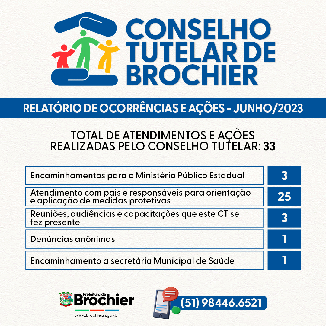 Os membros do Conselho Tutelar de Brochier, através do presente informativo, fazem chegar a público o relatório das ocorrências atendidas e demais ações realizadas pelo órgão durante os mês de junho de 2023.
