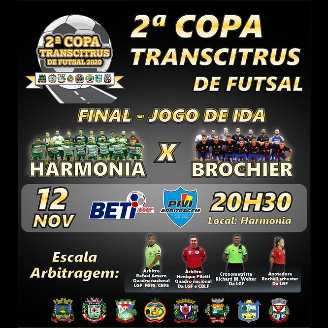 A primeira das duas partidas que decidem o campeão da 2ª Copa Transcitrus de Futsal acontece na noite de hoje, na cidade de Harmonia, a partir das 20h30. A seleção de Brochier, que nas semifinais passou pela equipe de Salvador do Sul nos pênaltis, enfrenta os donos da casa na disputa pelo título inédito. O jogo de volta acontece na próxima sexta-feira, 19/11, no Ginásio Municipal Darcy Fetzner, em Brochier.