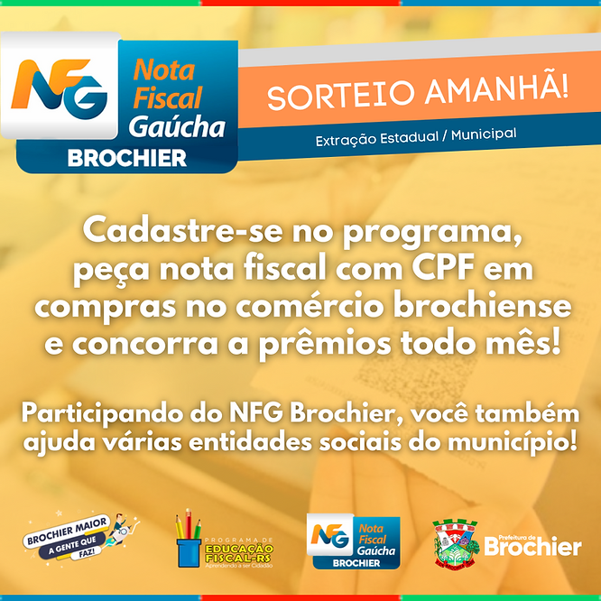 Nesta quinta-feira (30) ocorre o sorteio mensal do programa Nota Fiscal Gaúcha, referente ao mês de setembro. Em âmbito estadual, serão sorteados R$515 mil no total: além do prêmio principal de R$50 mil, há mais três premiações de R$5 mil, outras 200 de R$1 mil e 500 prêmios de R$500. Na extração municipal de Brochier deste mês, os três prêmios são de R$ 200, R$150 e R$100, respectivamente.