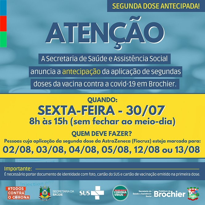 Em conformidade com as diretrizes do Plano Nacional de Vacinação, a Secretaria da Saúde e Assistência Social anuncia a ANTECIPAÇÃO da aplicação de segundas doses da vacina contra o coronavírus em Brochier.