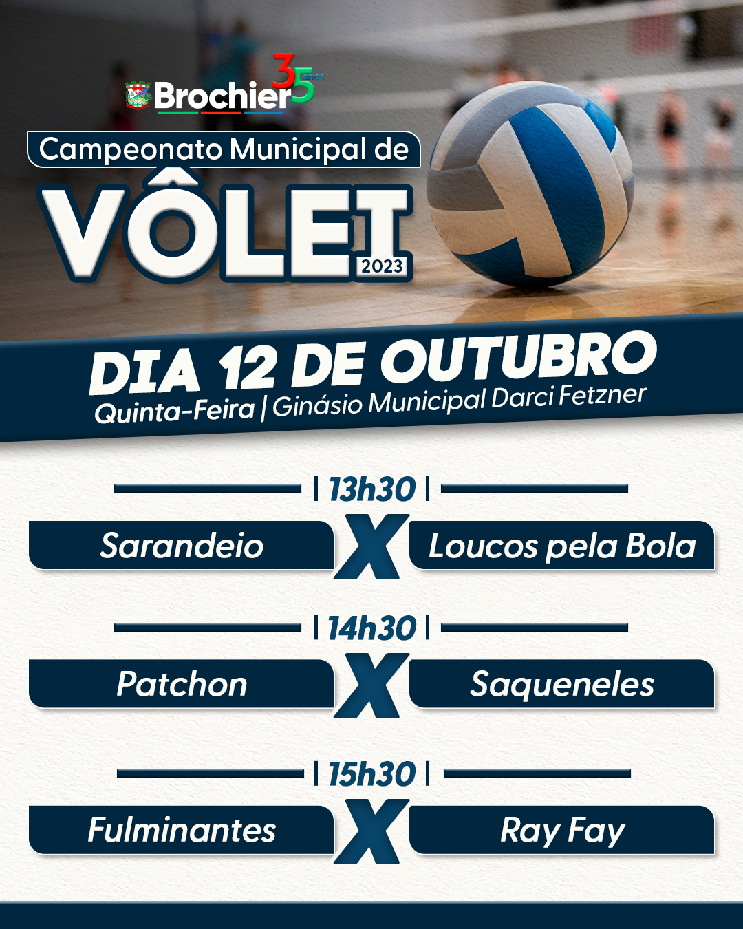 No dia 12 de outubro iniciará o Campeonato Municipal de Vôlei 2023. Faça sua torcida e venha acompanhar estes grandes jogos!